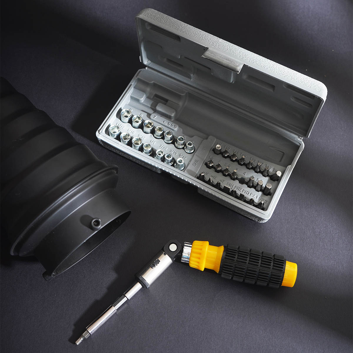 دارای 7 عدد بکس درایو 1.4 میلیمتر به سایزهای 4,5,5.5.6,7,8,9\r\nدارای 7 عدد بکس درایو 1.4 اینچ به سایزهای 5.32, 3.16, 7.32, 1.4 , 9.23, 5.16, 11.23 \r\nدارای 7 عدد سری آلن ستاره ای به سایزهای T10,T15, T20, T25, T27, T30, T40\r\nدارای 8 عدد سری آلن به سایزهای 1.5, 2 , 2.5 , 3,4,5,5.5,6\r\nدارای 3 عدد سری دو سو \r\nدارای 3 عدد سری چهارسو \r\nدارای 3 عدد سری