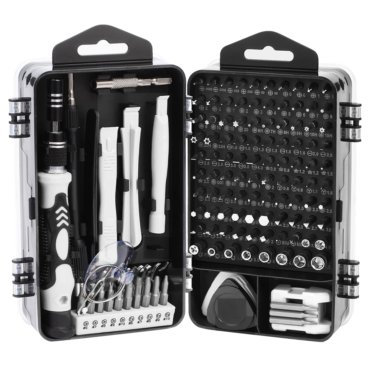 ست کامل ابزار: همراه با آهنربا/مغناطیس‌زدا، پد مغناطیسی، ابزار بازکن پلاستیکی، اسپاجر، موچین ضدزنگ، نگهدارنده بیت و شفت انعطاف‌پذیر